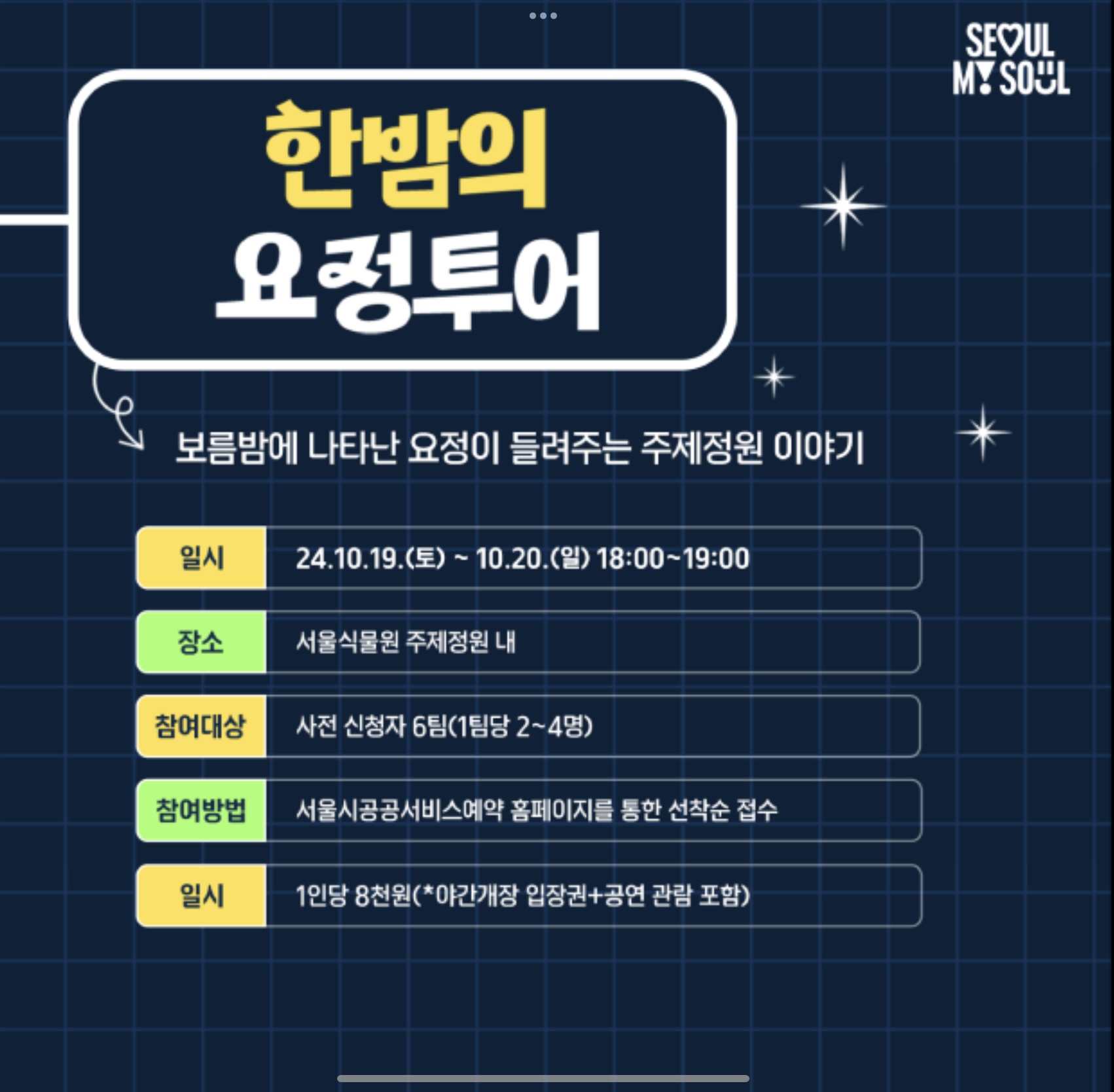 보름달이 떠오르는 밤, 요정들이 살 것 같은 서울식물원을 직접 탐험할 수 있는 기회입니다. 이번 투어에서는 가이드와 함께 다양한 식물들을 관찰하고, 서울식물원만의 매력을 한껏 느껴볼 수 있어요. 요정 이야기가 더해져 어린아이들도 무척 좋아할 만한 프로그램이 될 것 같아요.