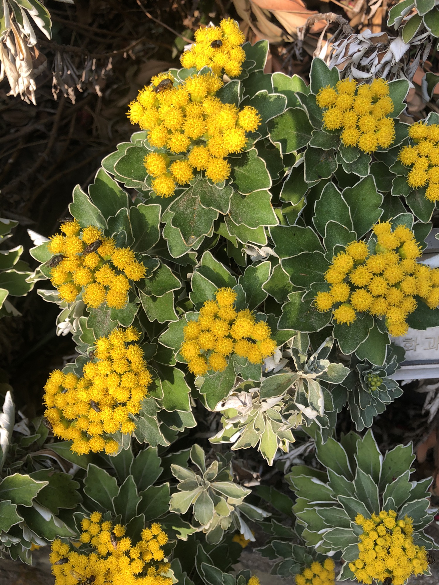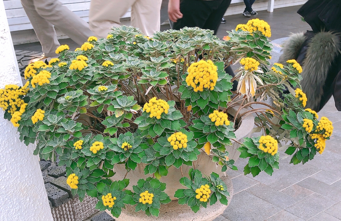 갯국화는 작고 노란 꽃송이가 모여 있는 둥근 형태를 이루며, 잎은 진녹색에 가장자리가 톱니 모양을 띱니다. 그 형태는 고요하면서도 화려한 분위기를 연출합니다.